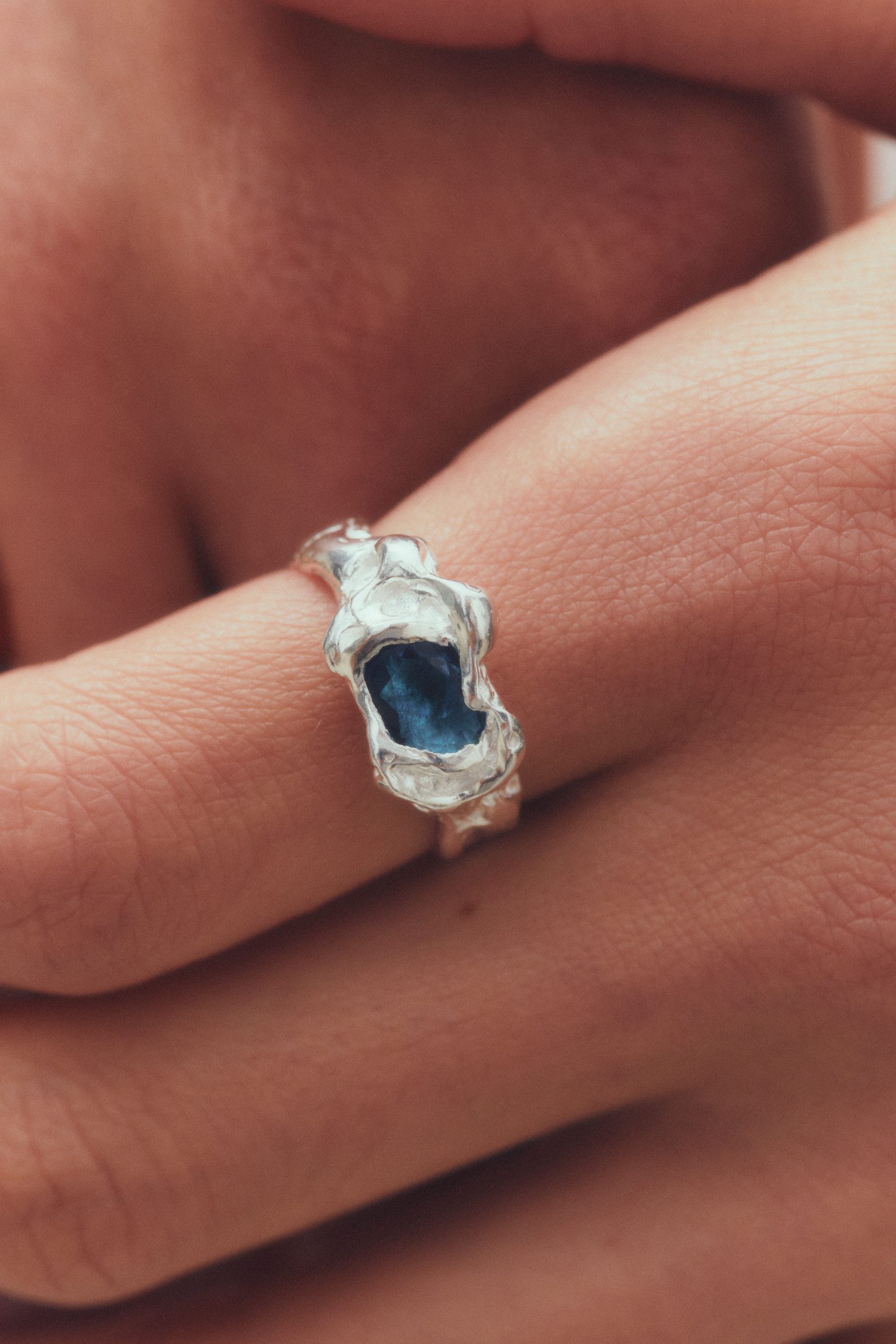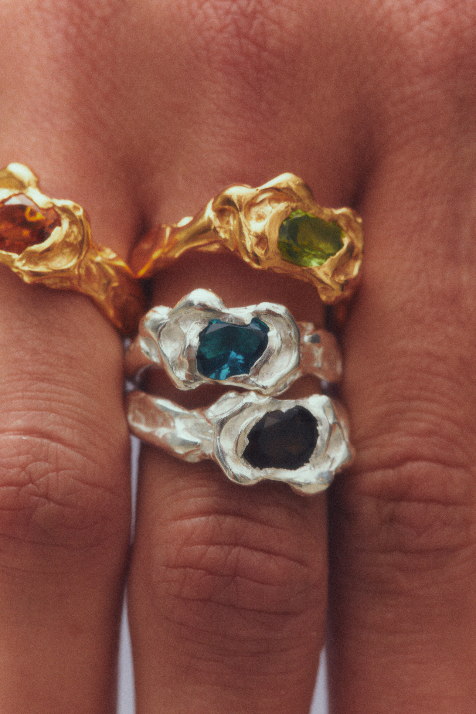 Ring with stone from the La Costa collection. A collection of archaeological pieces inspired by the sea. Pieces of precious stones, bright colors, sea forms, and grooves created by sand.