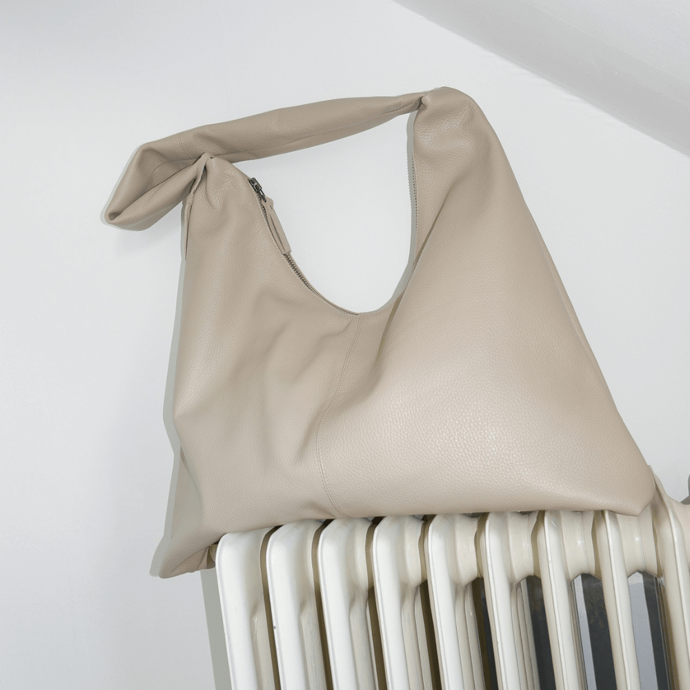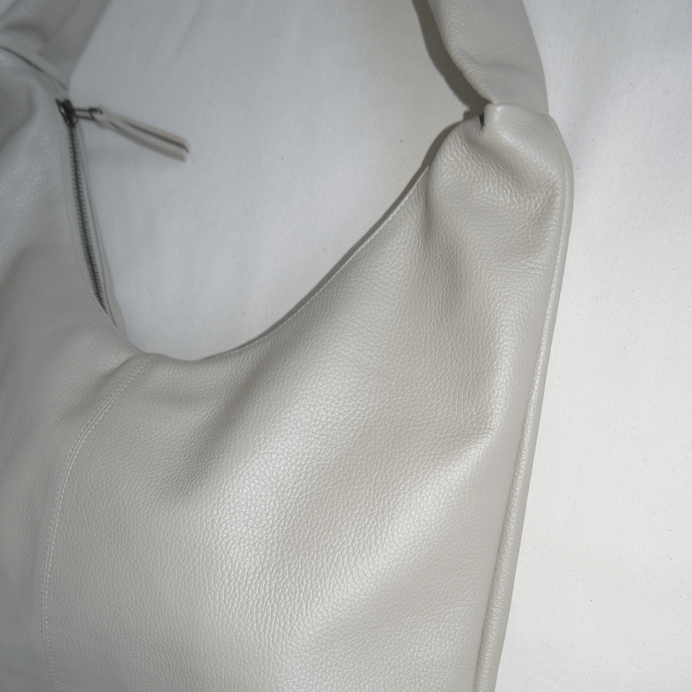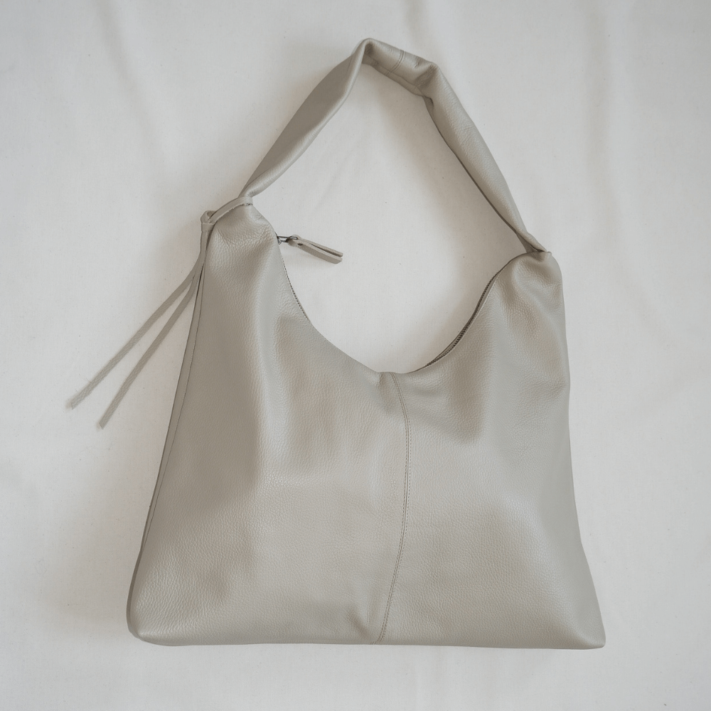 Střední crossbody kabelka ze strukturované šedobéžové kůže. Zapíná se na staromosazný zip. Vejde se do ní tablet nebo malý notebook. Uvnitř má přihrádky na telefon/klíče. Materiál: přírodní kůže, podšívka ze 100% organické bavlny. Rozměry: (46 cm x 44 cm x 8 cm), ramenní pás ±80 cm. Ručně vyrobeno v Barceloně.