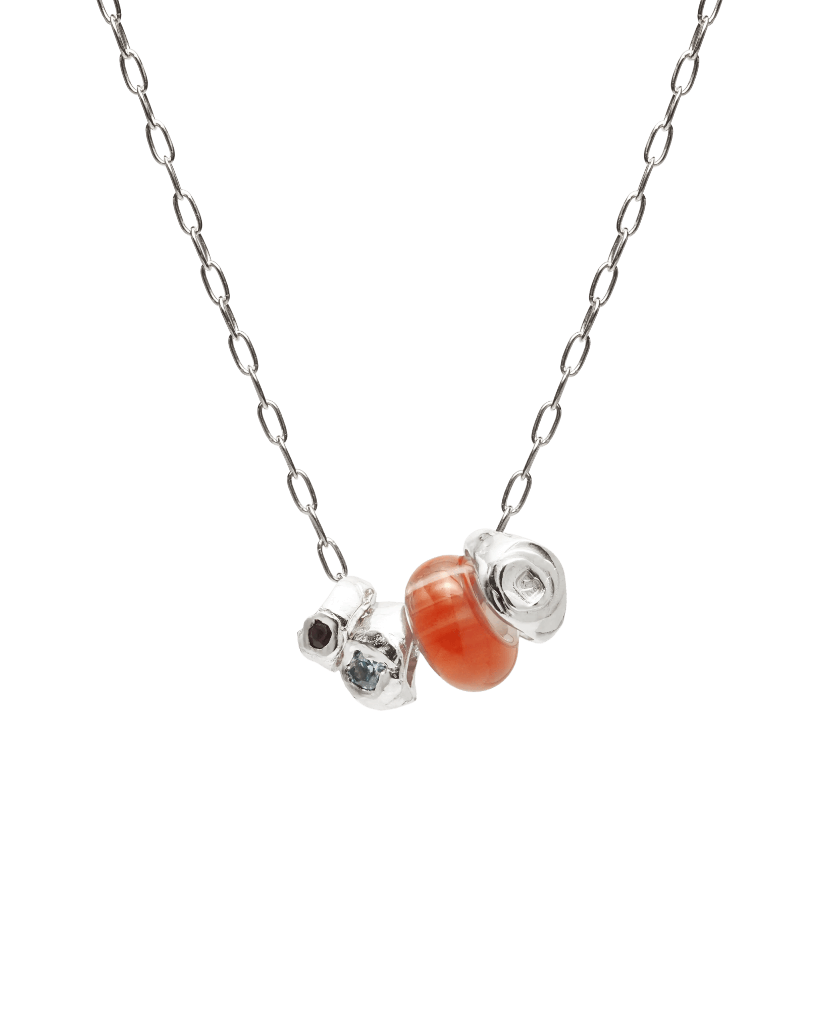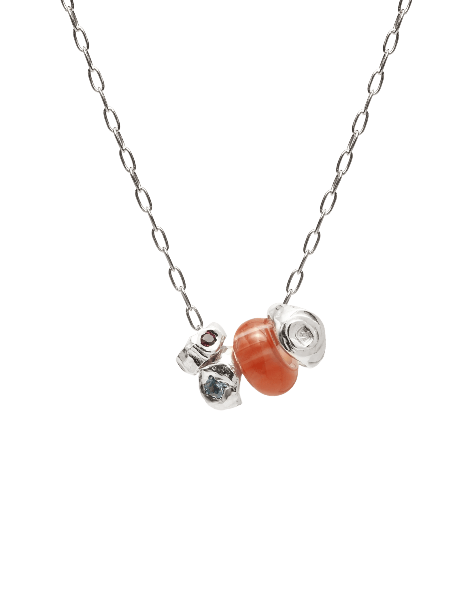 Kameny: Korálek z oranžového achátu, modrý zirkon, růžový granát.